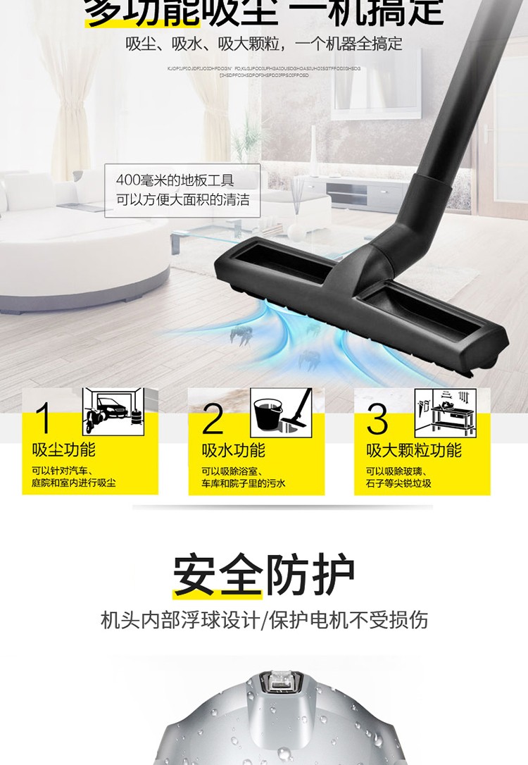 卡赫(KARCHER)桶式吸塵器,桶式大吸力干濕多用大功率地毯辦公酒店裝修洗車桶式吸塵器凱馳NT38 Me classic。真正大吸力,1500瓦高性能電機,真空度22.7kpa,干濕多用,20L大容量,金屬機身,吸力強勁。運用德國工藝,根據(jù)客戶需求研發(fā)的該系列產(chǎn)品簡單、便于維修,面向?qū)I(yè)高品質(zhì)需求市場。大容量塵箱一次搞定大面積清潔,吸取各種污垢毫不費力,有效去除硬地面上的液體、粗顆粒及灰塵,給人煥然一新的清潔效果。四重過濾,防止二次污染,堅固易于維修和保養(yǎng),拆卸渦輪機僅需半分鐘,不僅節(jié)省時間,也節(jié)約了成本。附件存放便利,隨拿隨用,多種吸嘴和扒頭彎把可應(yīng)對多種死角。德系精工,傾心之作,德國強芯,動力持續(xù)不衰。
